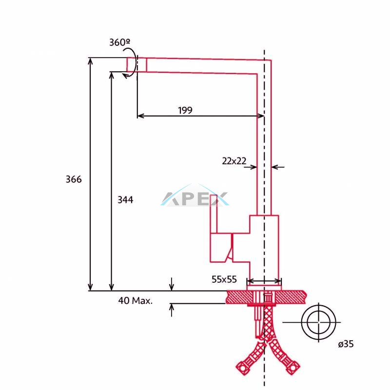 Rozsdamentes acél csaptelep, 360º-ban forgatható “L” alakú csaptelep, Vízpermetes mechanizmus, Kerámiabetét, Flexibilis bekötőcső, Elforgatható fej