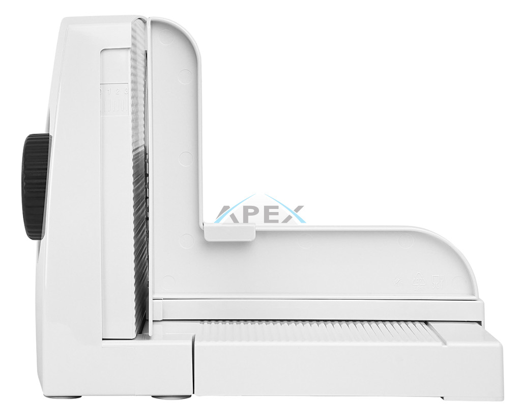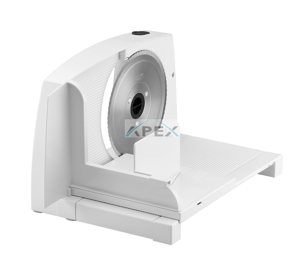 • Műanyag változat, fehér színben, fogazott kés 17 cm-es átmérővel, biztonsági kapcsoló szakaszos és folyamatos működéshez, levehető és osztható csúszka a helytakarékos tároláshoz, 230 V, 65 W