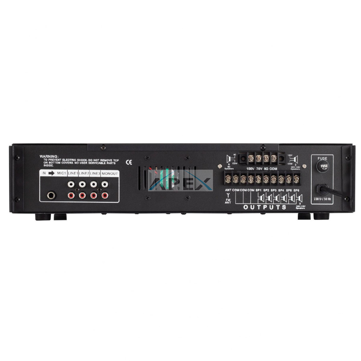 A 100 V-os hangszórókhoz 6 független csoportba köthető és szabályozható csatlakozásokat kínál. A kimeneti lehetőségek között RCA (mono) kimenet is szerepel, amely további erősítők vagy hangrögzítők csatlakoztatását teszi lehetővé. A 230 V-os tápellátás és a masszív, 6,8 kg-os kivitel hosszú távú megbízhatóságot garantál.