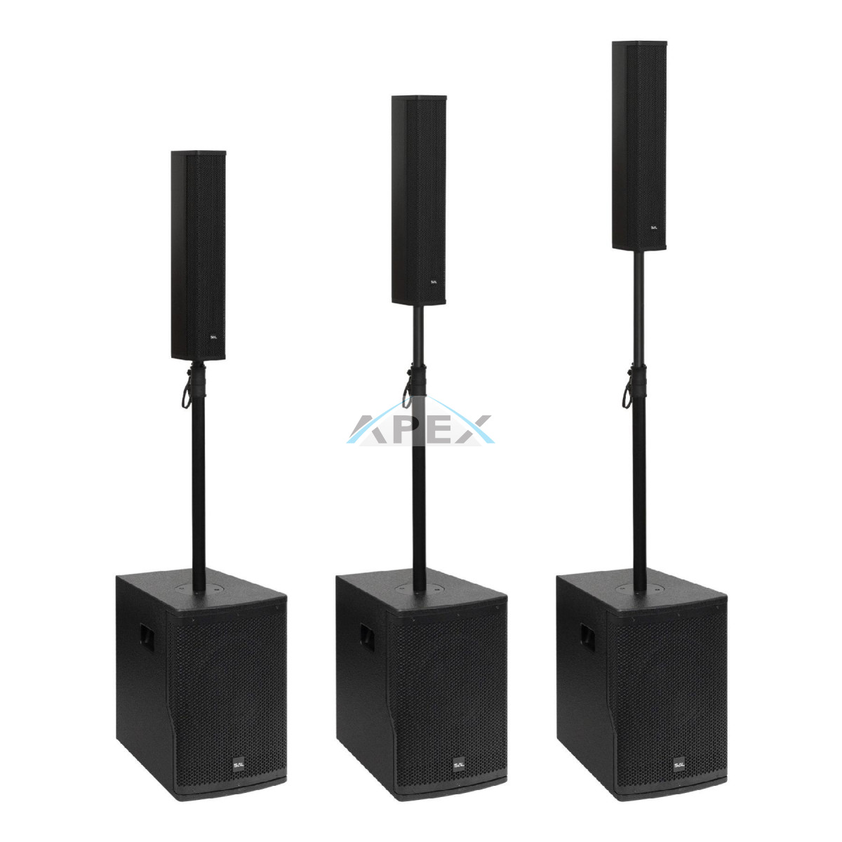 SAL PAS10W43S professzionális oszlopsugárzó hangrendszer, max. 800 W, 25cm mélysugárzó, 4x3” szélessávú satellit hangszóró, aktív zenekari hangdoboz, Bluetooth, fém állvány