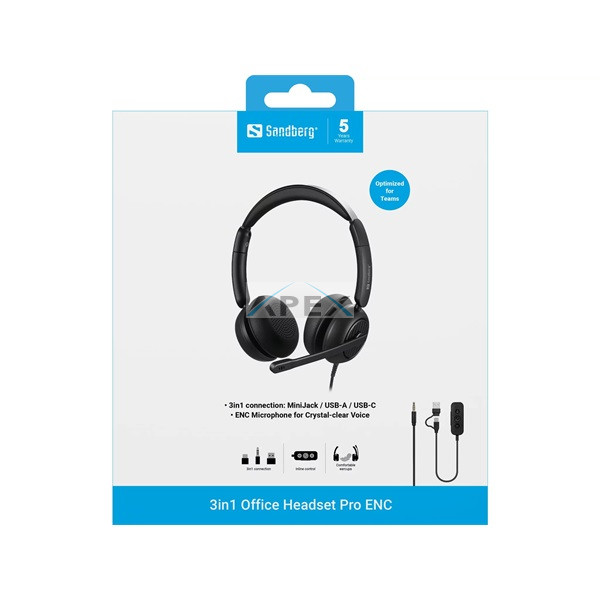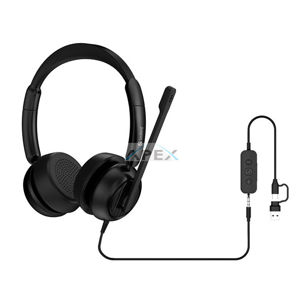 SANDBERG 3 in 1 Headset mikrofonnal, 3,5 mm minijack, USB-A és USB-C csatlakozó, hang szabályozás némítás, 5 év garancia