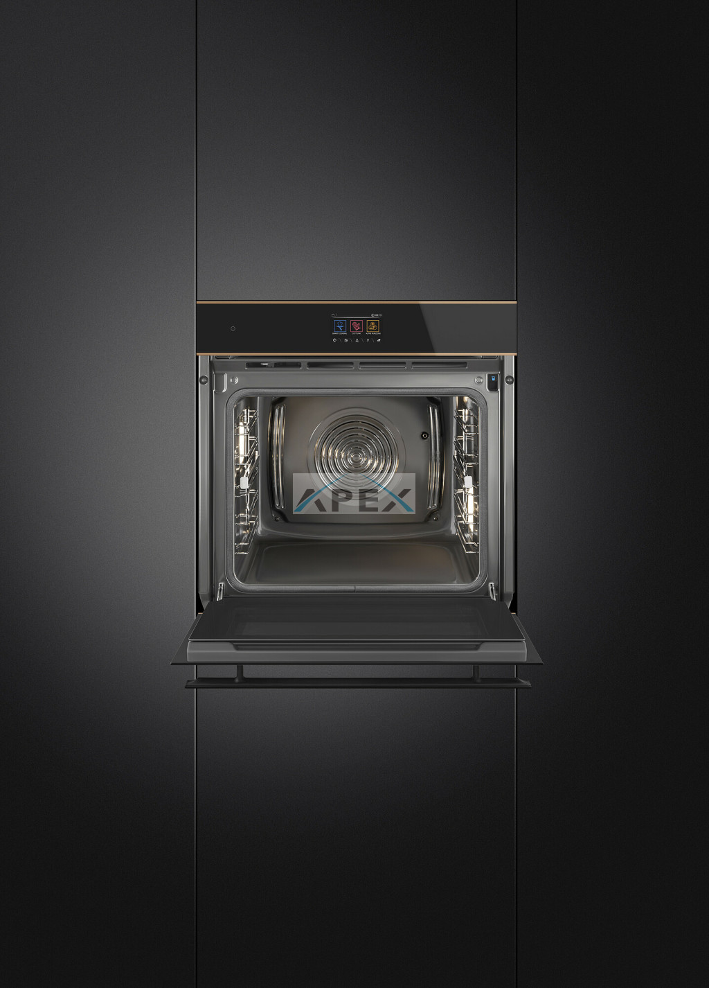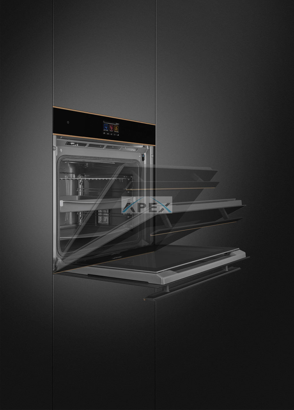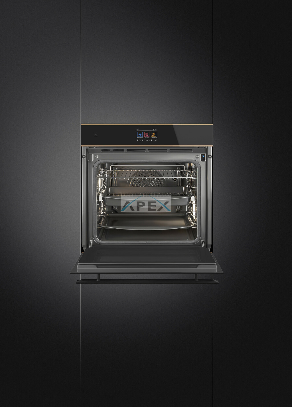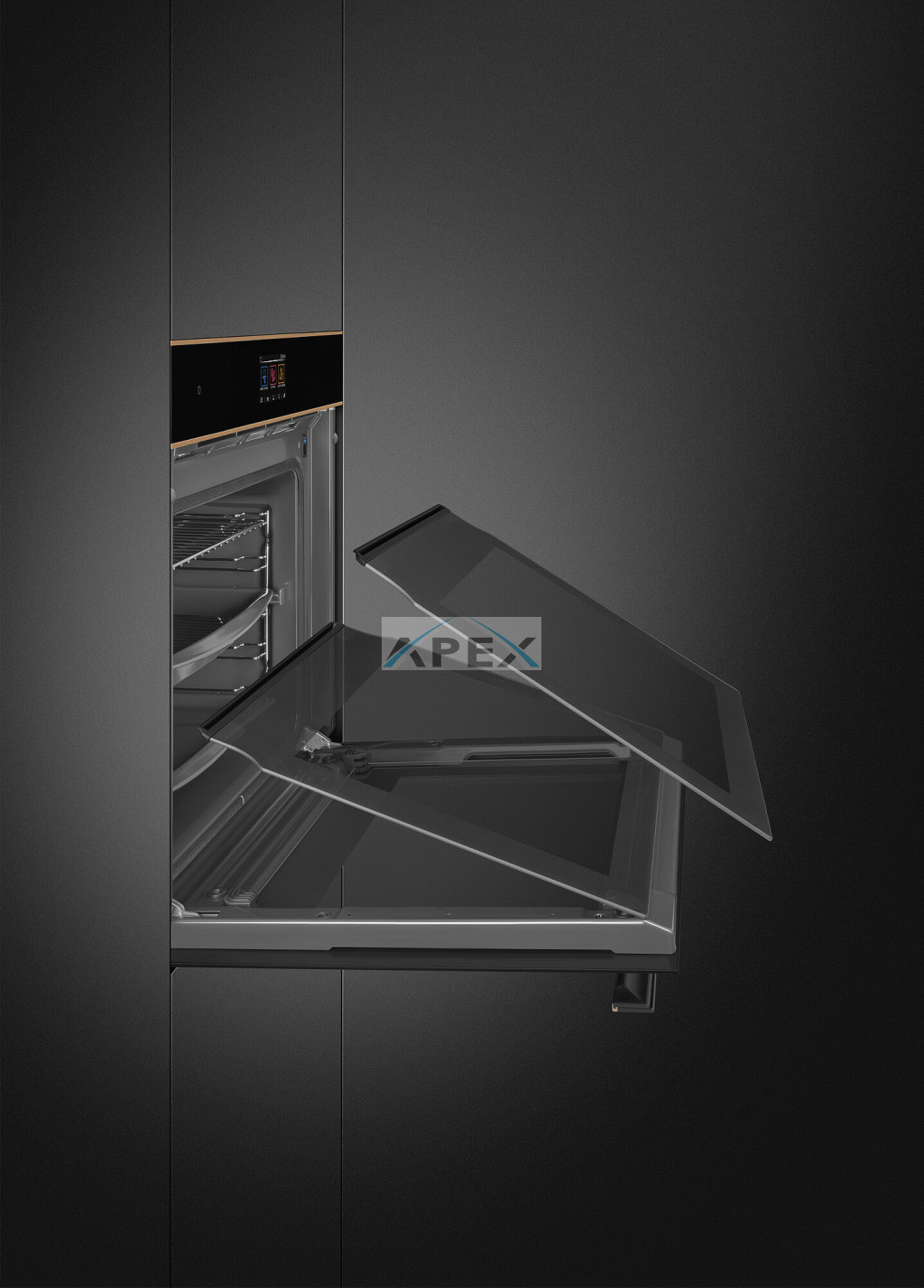 SMEG KOMBINÁLT PIROLITIKUS SÜTŐ, GŐZFUNKCIÓVAL, Dolce Stil Novo design, 60 cm, Galileo platform, SteamOne, VivoScreen TFT kijelző, fekete üveg, réz díszítés