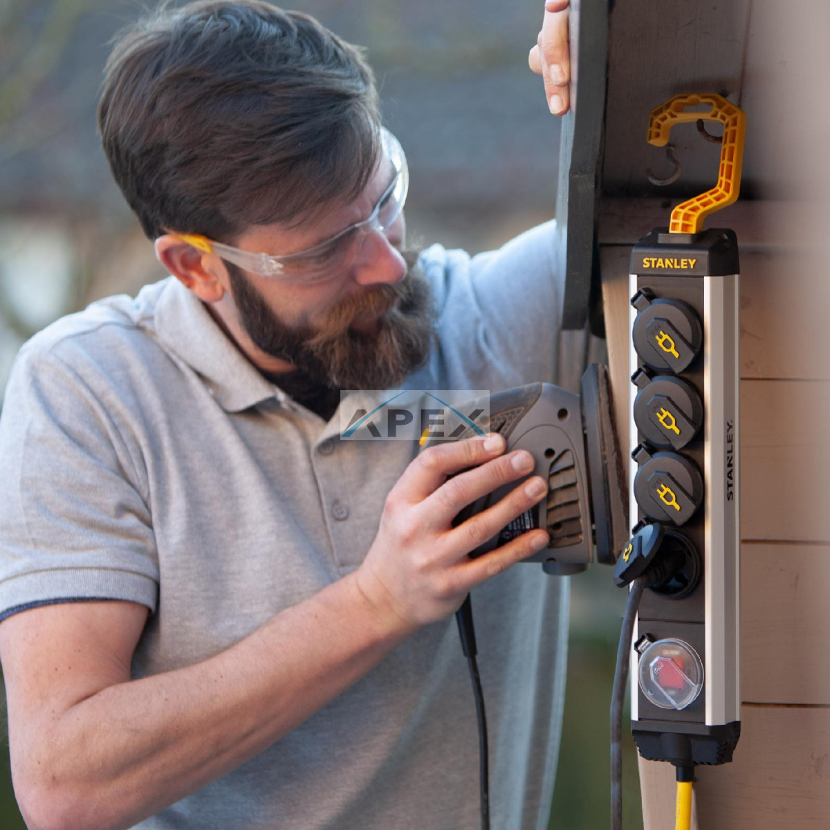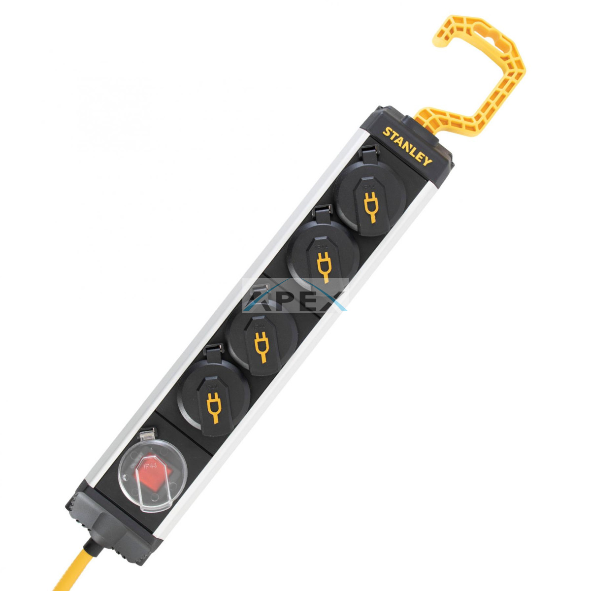 STANLEY SXECCD0RAJE 4-es elosztó kapcsolóval, 5 m, IP44-es védelem, alumínium ház, felakasztható, beltérben is használható, H07RN-F 3G1,5 mm2 kábel