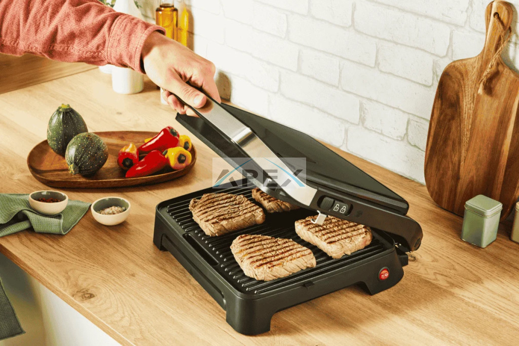 • Kontakt grill: A felső lap közvetlenül ráhajlik az ételre (steak, szendvics, panini).
