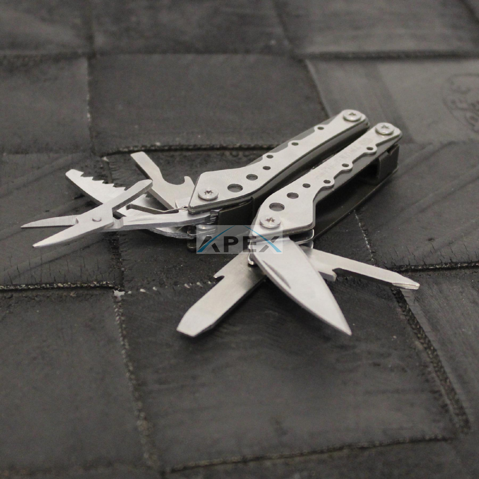 10 funkció • csillagfejű csavarhúzó, olló, sörnyitó, közepes laposfejű csavarhúzó, fűrész, rugós, rozsdamentes harapófogó, drótvágó, nagy laposfejű csavarhúzó, reszelő, kés