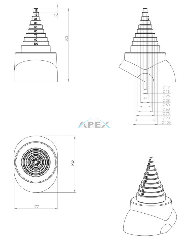 Méretek: Ø12/19/25/38/50/60/75/90 mm-es méretekhez.
