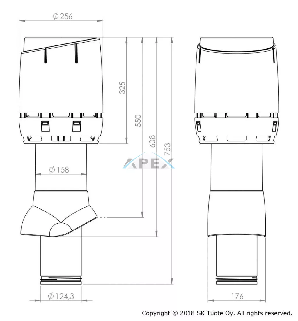 Ferde tetőn elhelyezhető szigetelt szellőzőcső esővédő sapkával, időjárásálló kivitelben. A horganyzott acéllemezből készült, fésűs tömítéssel rendelkező belső cső szigetelése csökkenti, ideális esetben akár meg is szüntetheti elvezett levegő páratartamának kicsapódását és az ezzel járó kondenzációs csapadék visszaszivárgását a csőrendszeren keresztül. Külső burkolata kiváló minőségű, anyagában színezett polipropilén, amely ellenáll környezeti hatásoknak széles hőmérsékleti tartományban (-30 °C ... +80 °C között).