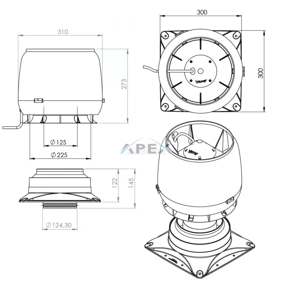 Lapos tetőn elhelyezhető tetőventilátor, 230V / 50 Hz-es AC motorral, 300 x 300 mm-es rögzítőkészlettel, esővédő sapkával, időjárásálló kivitelben. Külső burkolata kiváló minőségű, anyagában színezett polipropilén, amely ellenáll környezeti hatásoknak széles hőmérsékleti tartományban (-30 °C ... +80 °C között).