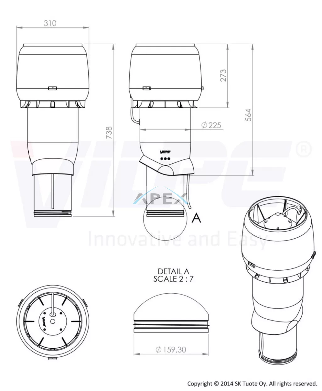 Ferde tetőn elhelyezhető szigetelt tetőventilátor, 230V / 50 Hz-es AC motorral, esővédő sapkával, időjárásálló kivitelben. A horganyzott acéllemezből készült, fésűs tömítéssel rendelkező belső cső szigetelése csökkenti, ideális esetben akár meg is szüntetheti elvezett levegő páratartamának kicsapódását és az ezzel járó kondenzációs csapadék visszaszivárgását a csőrendszeren keresztül. Külső burkolata kiváló minőségű, anyagában színezett polipropilén, amely ellenáll környezeti hatásoknak széles hőmérsékleti tartományban (-30 °C ... +80 °C között).