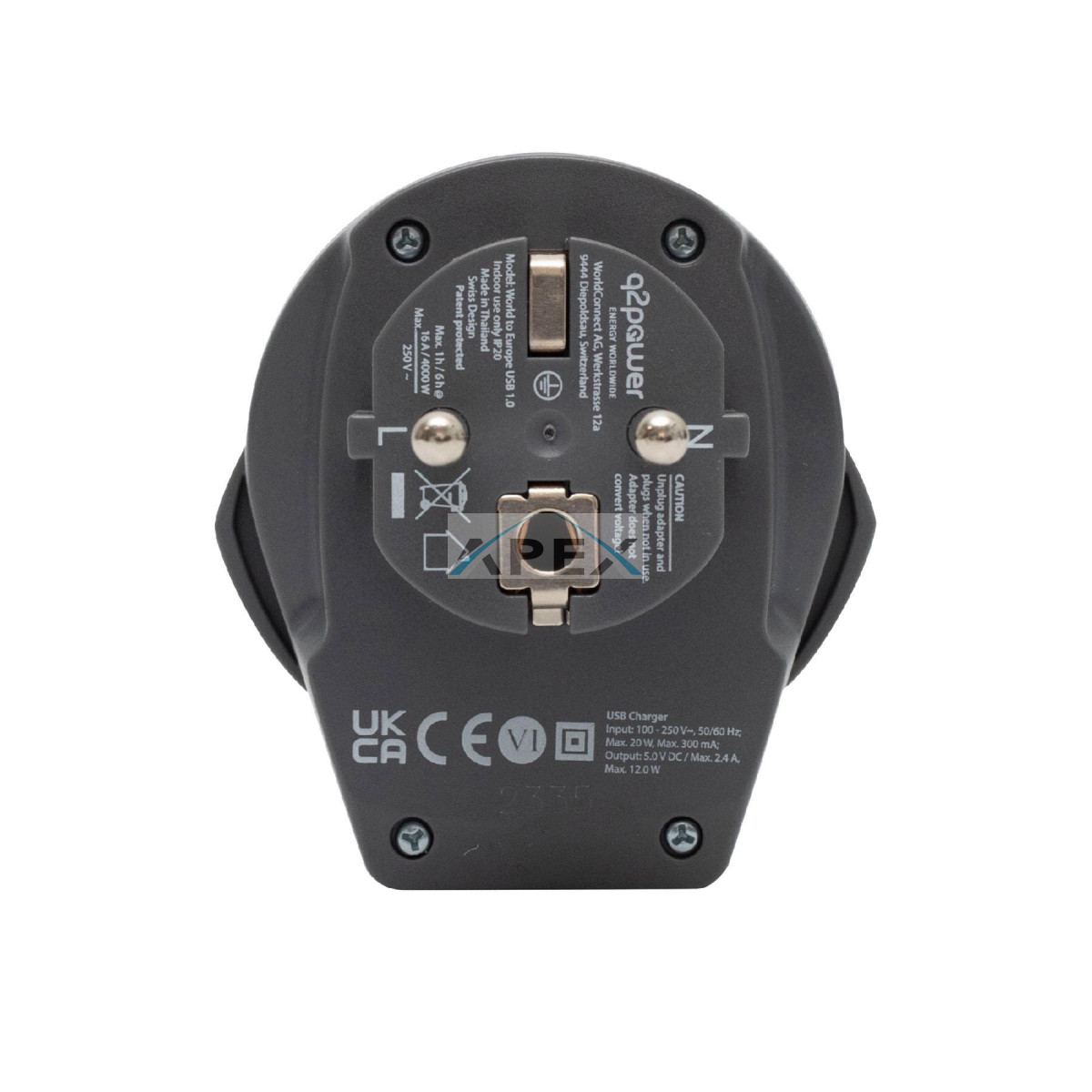 q2power 1.100110-TH utazóadapter, World to Europe USB, USB 5V 2.4A, max. 16 A, 250 V - 4000 W teljesítmény