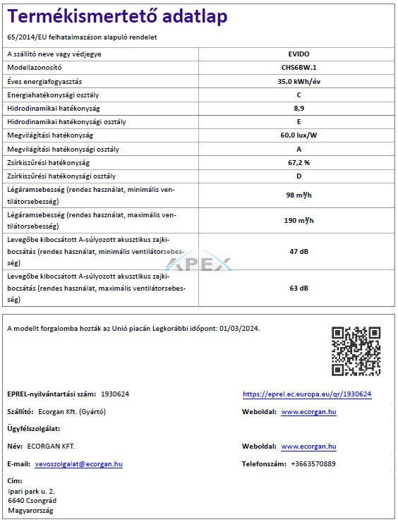 EVIDO DUALFLOW 60W hagyományos páraelszívó, 60 cm, fehér