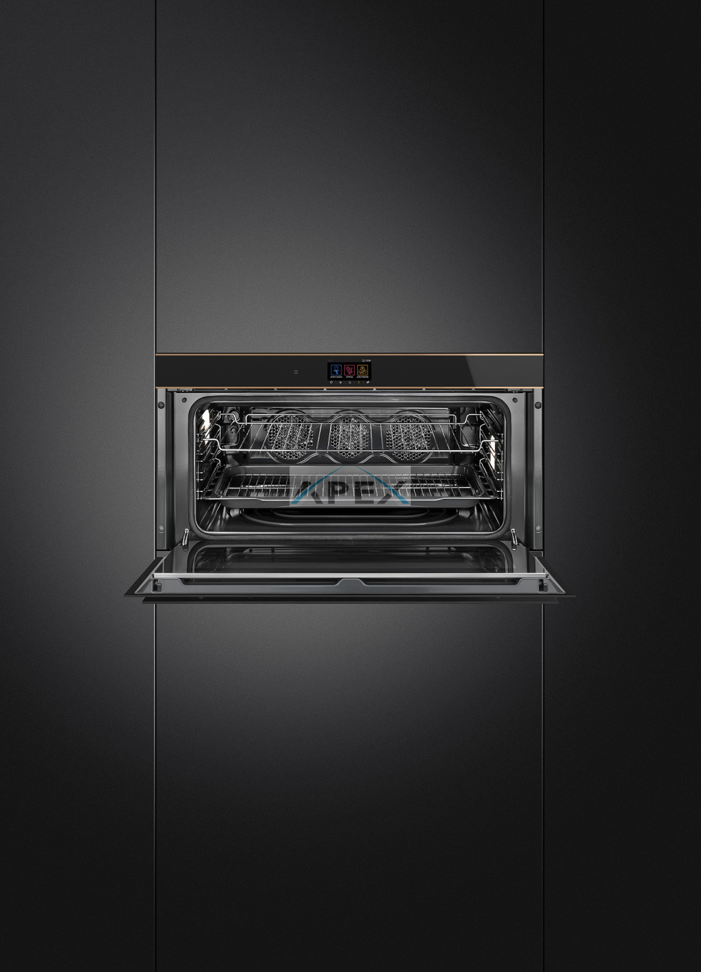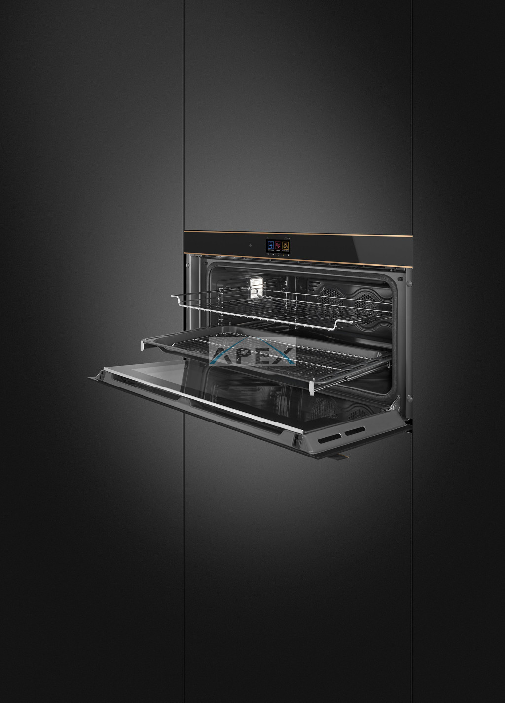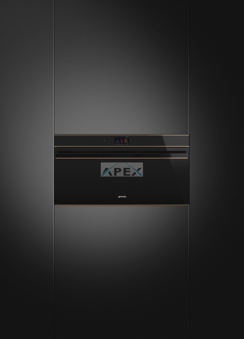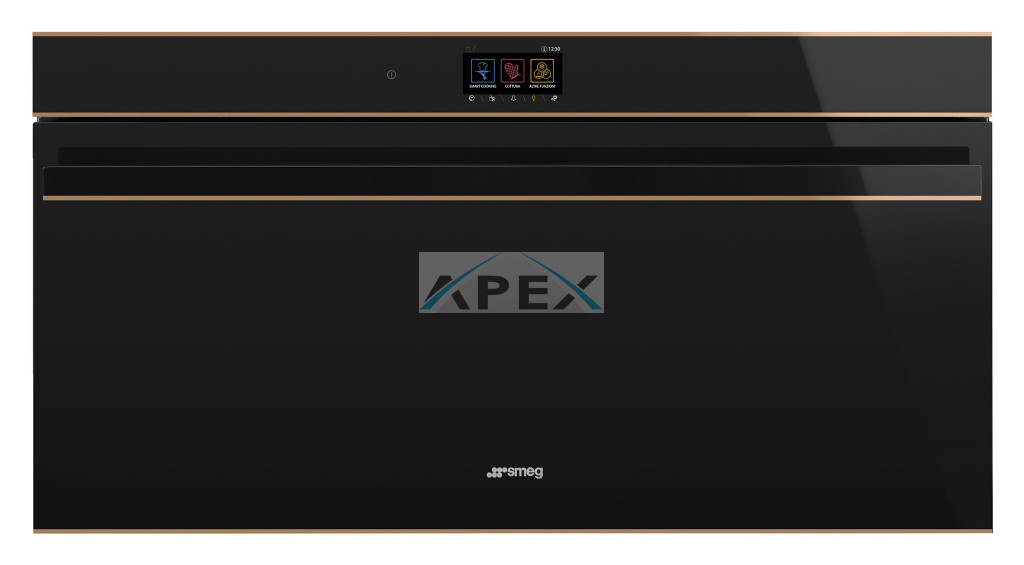 SMEG PIROLITIKUS HŐLÉGKEVERÉSES XL SÜTŐ, Dolce Stil Novo design, 90x47,5 cm, TFT, fekete üveg, réz dísz