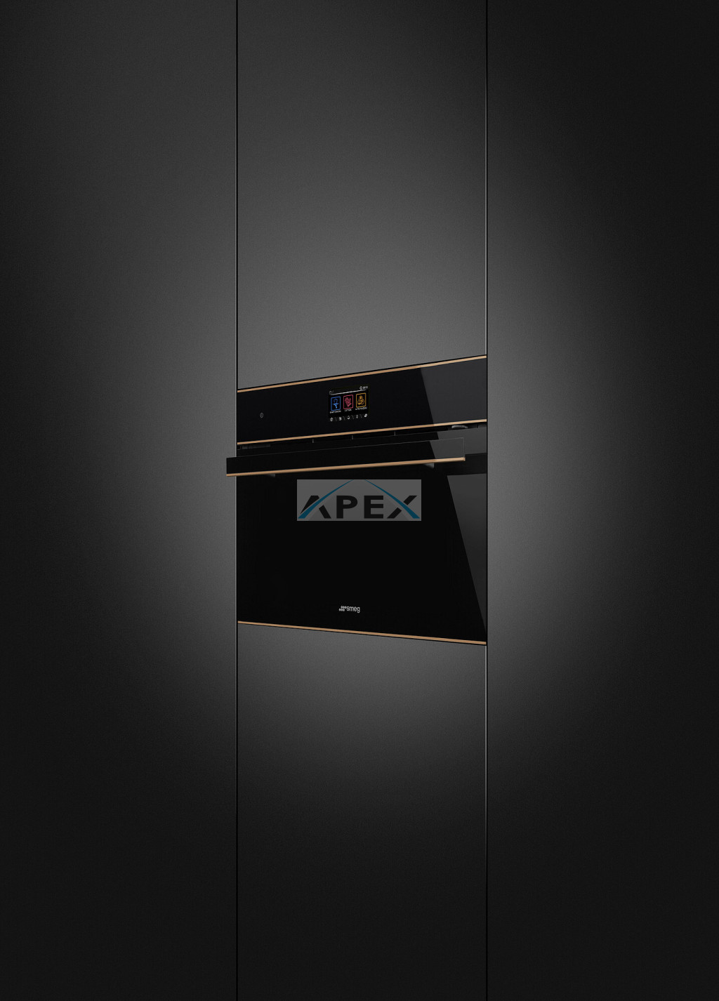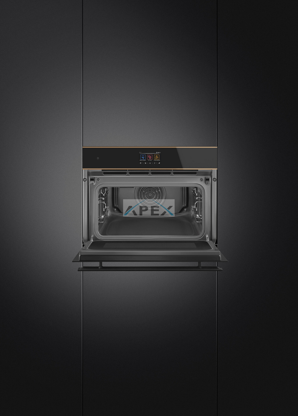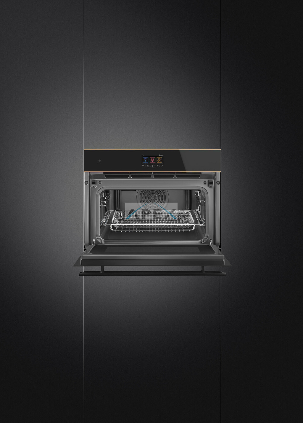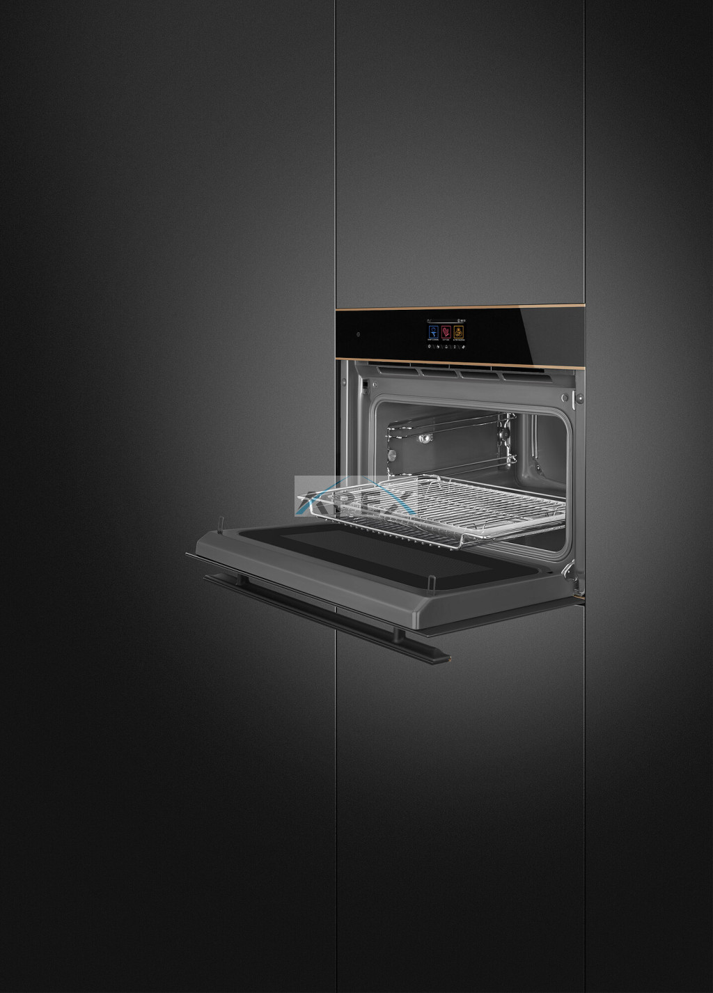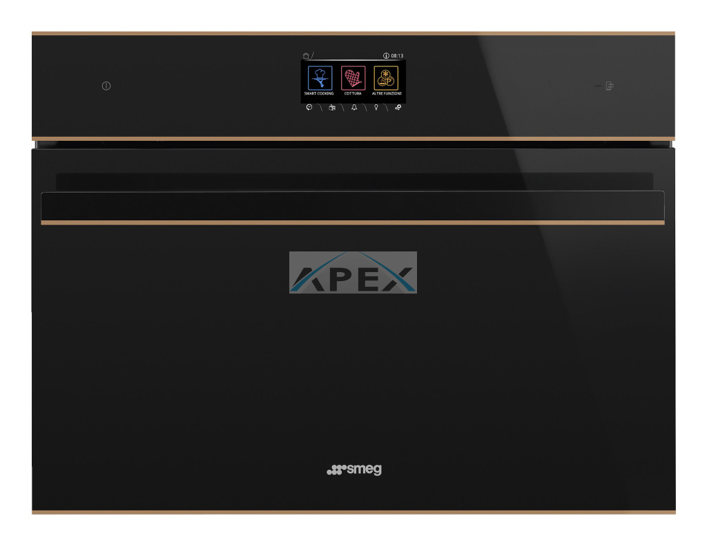 SMEG KOMPAKT KOMBINÁLT MIKROHULLÁMÚ SÜTŐ, Dolce Stil Novo design, Galileo, 45 cm, TFT, fekete üveg, réz dísz