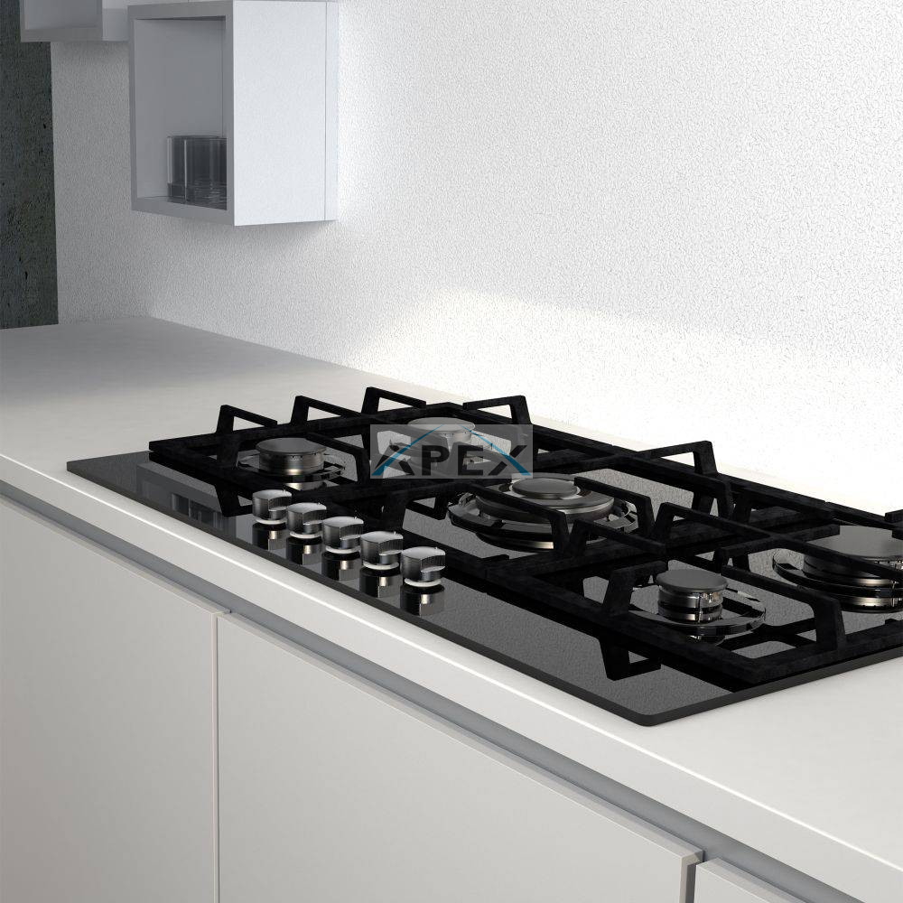 5 gázégő égésbiztosítóval, automata szikragyújtás, fekete üveg felület, öntöttvas rács, teljesítmény: 11 kW, 2 db közepes gázégő - 2x1,75 kW, 1 db tripla koronás WOK gázégő - 3,5 kW, 1 db nagy gázégő - 3 kW, 1 db normál gázégő - 1 kW