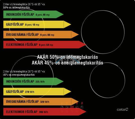 3 Indukciós főzőzóna, Slider Touch Control érintővezérlés, 9 fokozat, 1db 30/18 cm-es kétkörös, 1 db 21 cm-es, 1 db 16 cm-es főzőzóna, minden főzőzóna BOOSTER funkcióval, 3 főzési funkció: olvasztás (45-55ºC), melegítés, melegen tartás (65-70 ºC), forralás (85-95ºC), automata csatlakoztatási lehetőség a CATA páraelszívókhoz, gyerekzár, időzítő, maradékhő kijelzés, teljesítmény: 7,1 kW